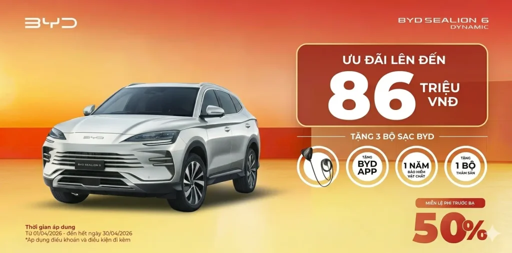 Trong tháng 04/2026, khi khách hàng lựa chọn BYD SEALION 6 Dynamic, tổng giá trị gói quà tặng và ưu đãi sẽ lên đến 86.000.000 VNĐ, bao gồm: