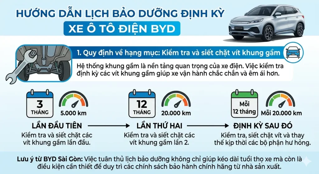 Lưu ý từ BYD Sài Gòn: Việc tuân thủ lịch bảo dưỡng không chỉ giúp kéo dài tuổi thọ xe mà còn là điều kiện cần thiết để duy trì các chính sách bảo hành chính hãng từ nhà sản xuất.