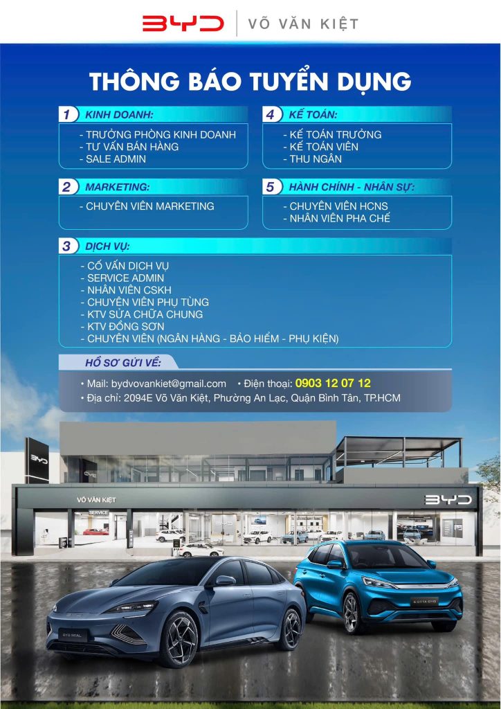 Hãy gia nhập BYD VÕ VĂN KIỆT – Nơi khởi đầu cho sự nghiệp sáng tạo và phát triển trong ngành công nghiệp xe điện toàn cầu! Chúng tôi mong chờ đón bạn vào đội ngũ của chúng tôi.