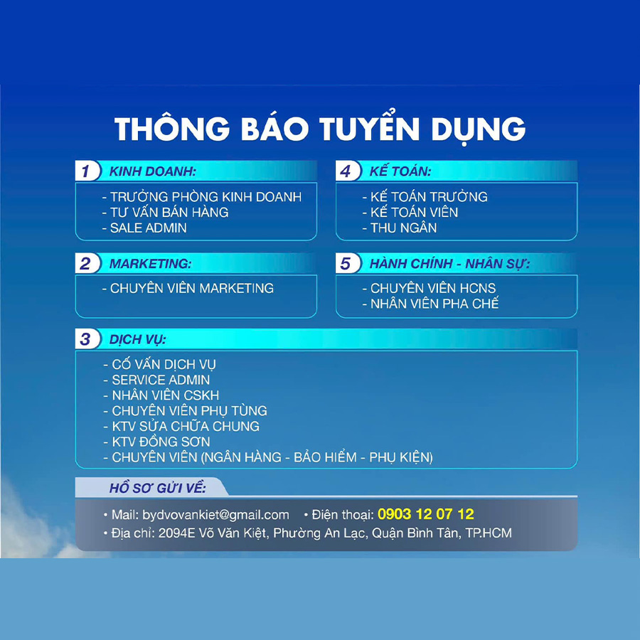 Hãy gửi CV của bạn về email: bydvovankiet@gmail.com hoặc liên hệ trực tiếp qua hotline: 0903 12 07 12 để biết thêm thông tin chi tiết và các bước tiếp theo trong quy trình ứng tuyển.